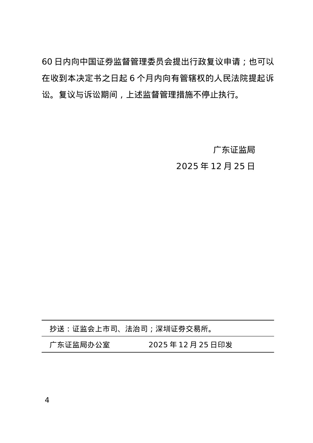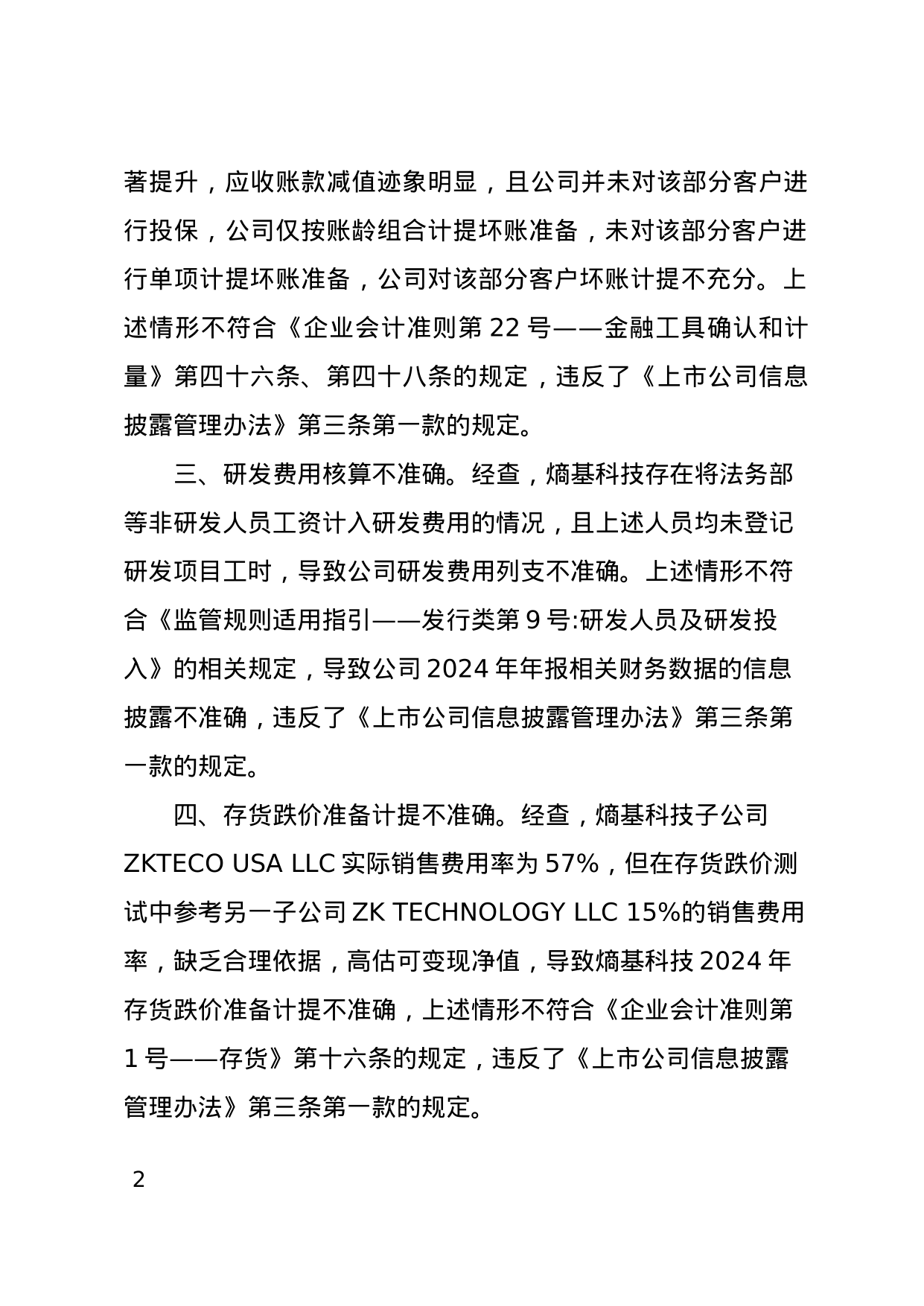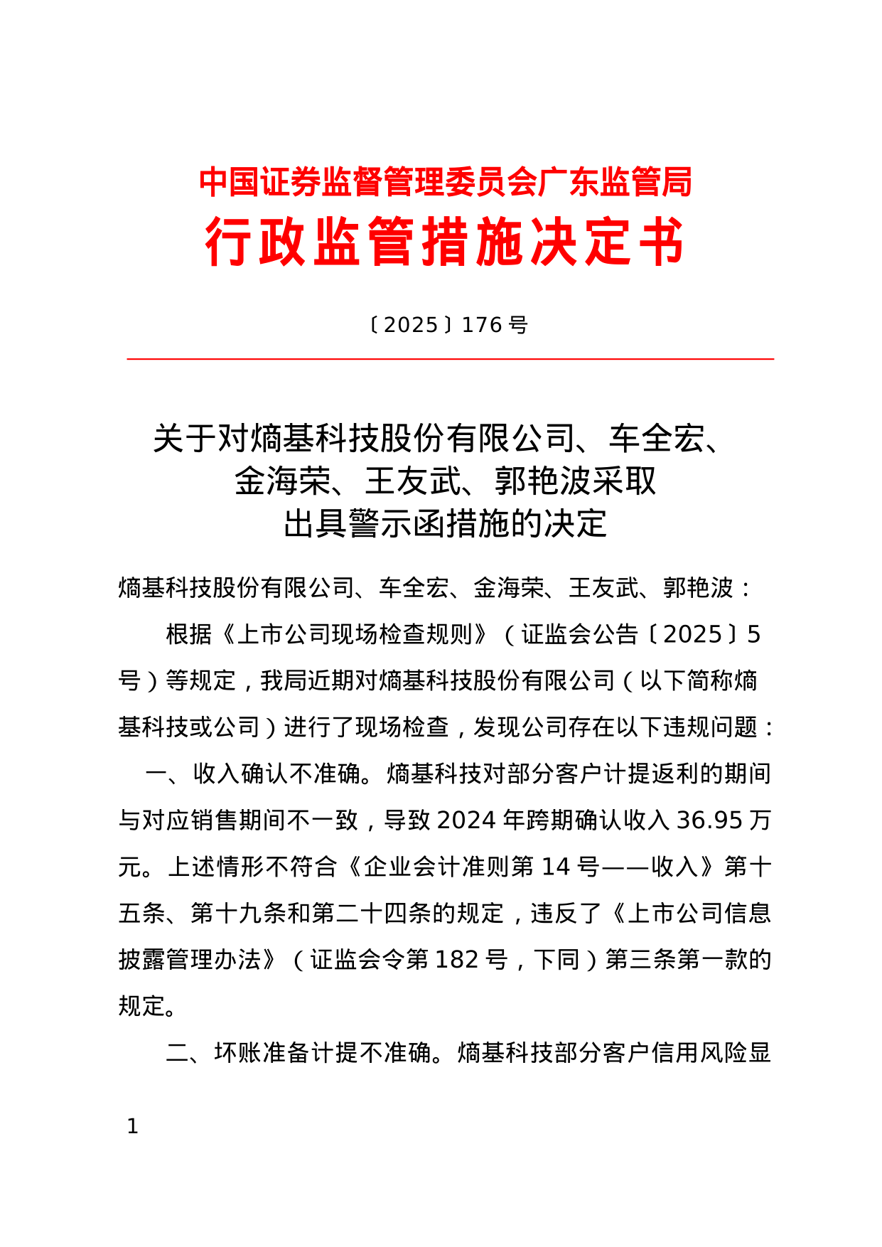 根据广东证监局的调查,熵基科技存在五项违规行为。首先,公司对部分客户的返利计提期间与销售期间不一致,导致2024年跨期确认收入36.95万元。其次,公司对部分信用风险显著提升的客户应收账款减值迹象明显,但未进行单项计提坏账准备,导致坏账计提不充分。此外,公司将非研发人员工资计入研发费用,且相关人员未登记研发项目工时,导致研发费用列支不准确。熵基科技在存货跌价测试中参考另一子公司的销售费用率,缺乏合理依据,导致存货跌价准备计提不准确。最后共赢优配,公司在《2024年年度报告》中披露的与关联方ZKTECO SOLUTIONS INC.的关联交易金额与实际销售金额不一致。熵基科技董事长车全宏、总经理金海荣、财务总监王友武、董事会秘书郭艳波未履行勤勉尽责义务,对公司上述行为负有主要责任。其中,车全宏和金海荣对所有违规行为负责,王友武对前四项违规行为负责,郭艳波对第五项违规行为负责。广东证监局根据《上市公司信息披露管理办法》第五十二条的规定,决定对熵基科技及上述责任人采取出具警示函的行政监管措施。公司及相关责任人需在收到决定书30日内提交书面报告,并抄报深圳证券交易所。如对监管措施有异议,相关方可在收到决定书之日起60日内向中国证监会提出行政复议申请,或在6个月内向有管辖权的人民法院提起诉讼。复议与诉讼期间,监管措施不停止执行。